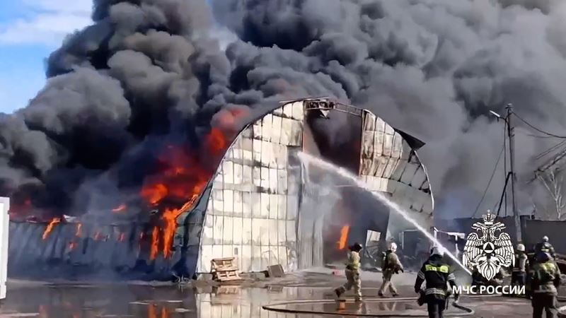 Последствия пожара в ангаре ликвидируют иркутские огнеборцы.